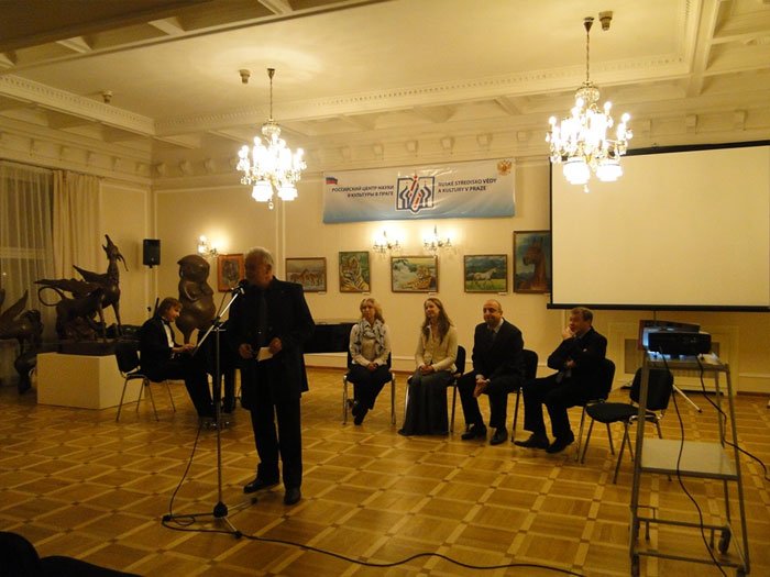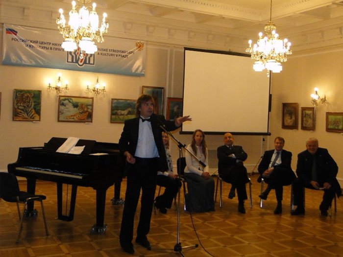Встречу артистов со зрителями Российского центра науки и культуры в Праге открыл директор РЦНК Л.А. Гамза. Он поприветствовал артистов из Санкт-Петербурга, которые прилетели в чешскую столицу, чтобы принять участие в Неделе русской словесности и показать на сцене недавно открывшегося Арт-центра МОСТ свои лучшие спектакли.