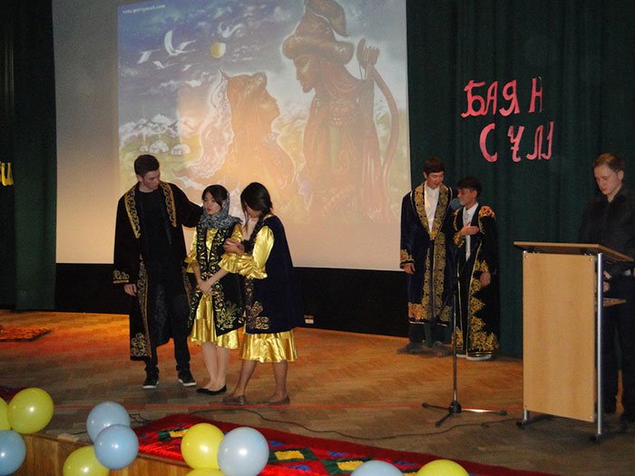 Moderátoři večera Andrej Kucaj a Bajan Chamitovová v kazašském i ruském jazyce zahájili slavnostní večer verši o jarní přírodě. Hlavní událostí celé akce byla soutěž „Kozy Korpeš – Bajan sulu« na odhalení nejkrásnějšího a nejtalentovanějšího páru. Účastníky byli ruští a kazašští mladí lidé: Ilja a Rajsa, Vitalij a Ajdana, Daulet a Benazir. Jejich herecké umění a talent oceňovala porota.