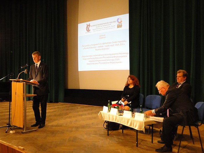 С развернутой презентацией состояния и потенциала экономического сотрудничества между странами ЕС и Россией выступила директор Департамента стран Европы и Америки Министерства экономического развития Российской Федерации Елена Данилова, которая также является заместителем сопредседателя Российско-Чешской межправительственной комиссии по экономическому, промышленному и научно-техническому сотрудничеству. Она подчеркнула, что на долю ЕС приходится 49,8% всего торгового оборота России или 417,4 млрд евро в 2013 году. Ответ России на санкции может быть только один – улучшение инвестиционных условий в стране. Сообщила, что в ходе состоявшихся перед семинаром переговоров в Министерстве промышленности и торговли чешской стороне были переданы на рассмотрение 8 новых крупных перспективных проектов двустороннего сотрудничества.