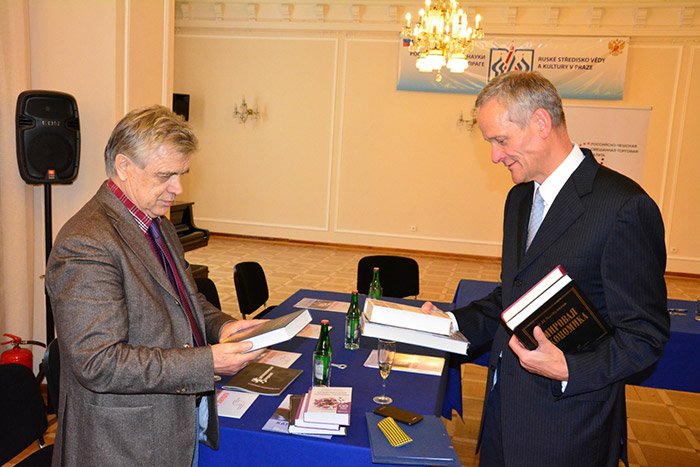 В церемонии принял участие член-корреспондент РАН, заведующий кафедрой мировой экономики РЭУ им. Г.В.Плеханова Руслан Хасбулатов, который передал в дар чешской Дипломатической академии несколько своих новых книг.