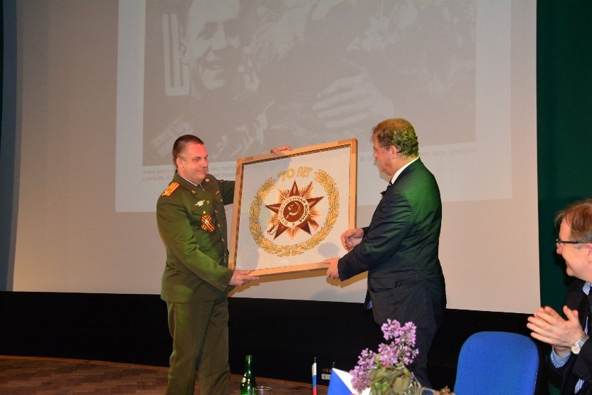 С приветствиями на вечере также выступили советник Посольства России в Чехии Андрей Кузнецов и военный атташе Посольства Олег Смирнов. Олег Смирнов вручил президенту «Клуба Россия» Зденеку Збытеку памятный подарок – пано с изображением Ордена Победы.