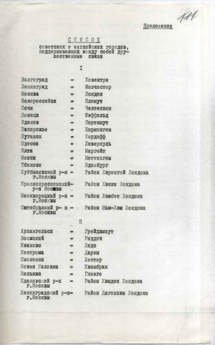 Так во время войны, английский город Ковентри и советский Сталинград установили дружественные отношения с целью обеспечения мира и благополучия граждан. До сих пор в музее боевой славы Сталинграда хранятся телеграмма и присланная в дар советскому городу огромная скатерть, на которой 830 женщин Ковентри вышили свои имена. Примечательно, что после завершения войны Ковентри стал побратимом немецкого Дрездена – города, который также был сильно разрушен. Это был шаг в сторону примирения.