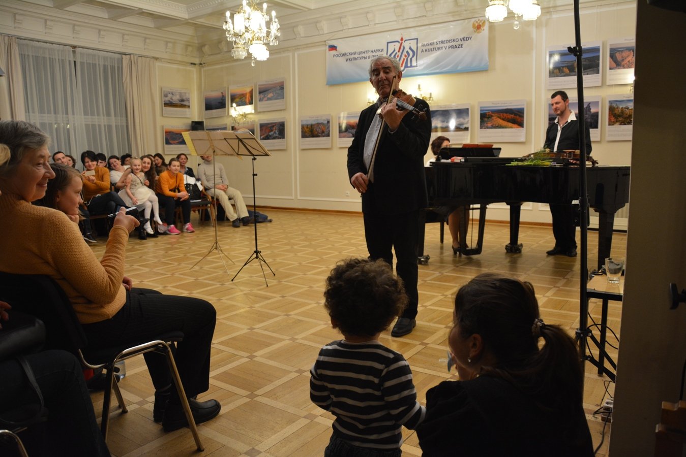 Poté se Michail Kazinik s diváky podělil o dojmy z pobytu v Praze. Zdůraznil, že Praha je hudební město a vše je v ní nasyceno hudbou. Vysoce ocenil talent významných českých skladatelů a rovněž krásu české lidové tvorby. Následně houslisté Boris Kazinik (Stockholm) a Alexandr Šonert (Praha) společně zahráli několik typicky českých melodií.