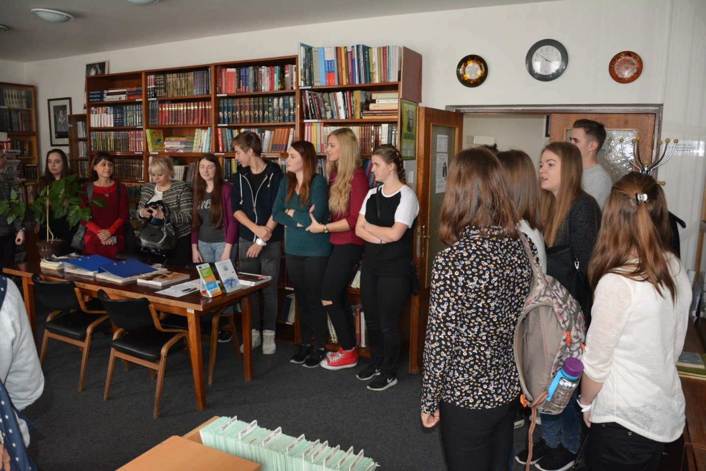 Затем студенты посетили библиотеку РЦНК, где познакомились с ее богатыми фондами русской литературы. Ребята с интересом рассматривали не только книги русских писателей, но и издания чешских и зарубежных авторов на русском языке. На книжных полках они нашли знакомые и любимые ими с детства книги «Гарри Поттер», сказку «Морозко» и «Мальчик-с-пальчик», а также книги русских классиков, о которых они слышали на уроках русского языка. Узнали, как можно стать читателями библиотеки, а также о новой возможности подключиться к электронной библиотеке книг на русском языке.