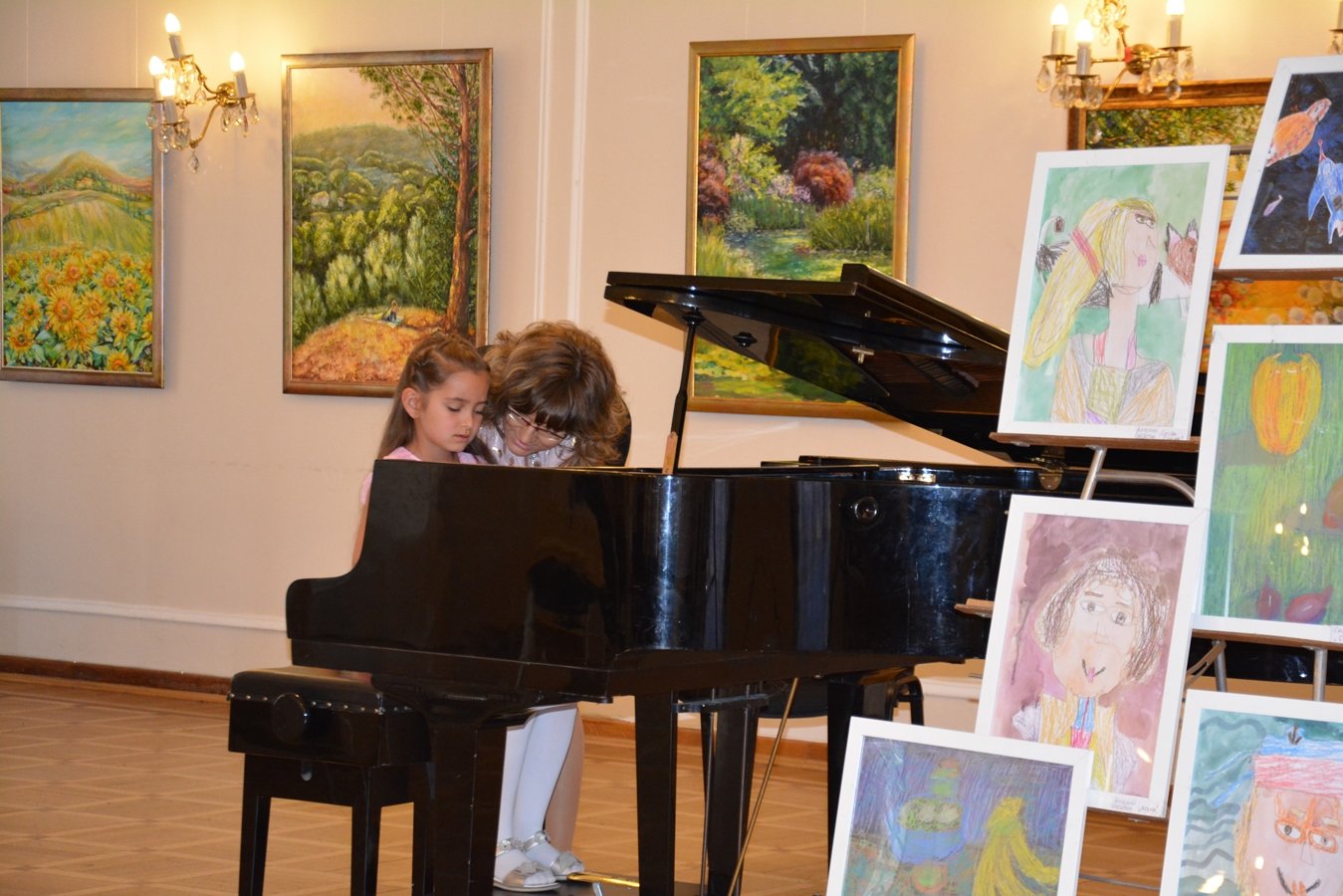 Участники и зрители концерта могли также ознакомиться с выставкой рисунков детской художественной студии «Веселые пальчики», которая была представлена в Хрустальном зале на специальных мольбертах.