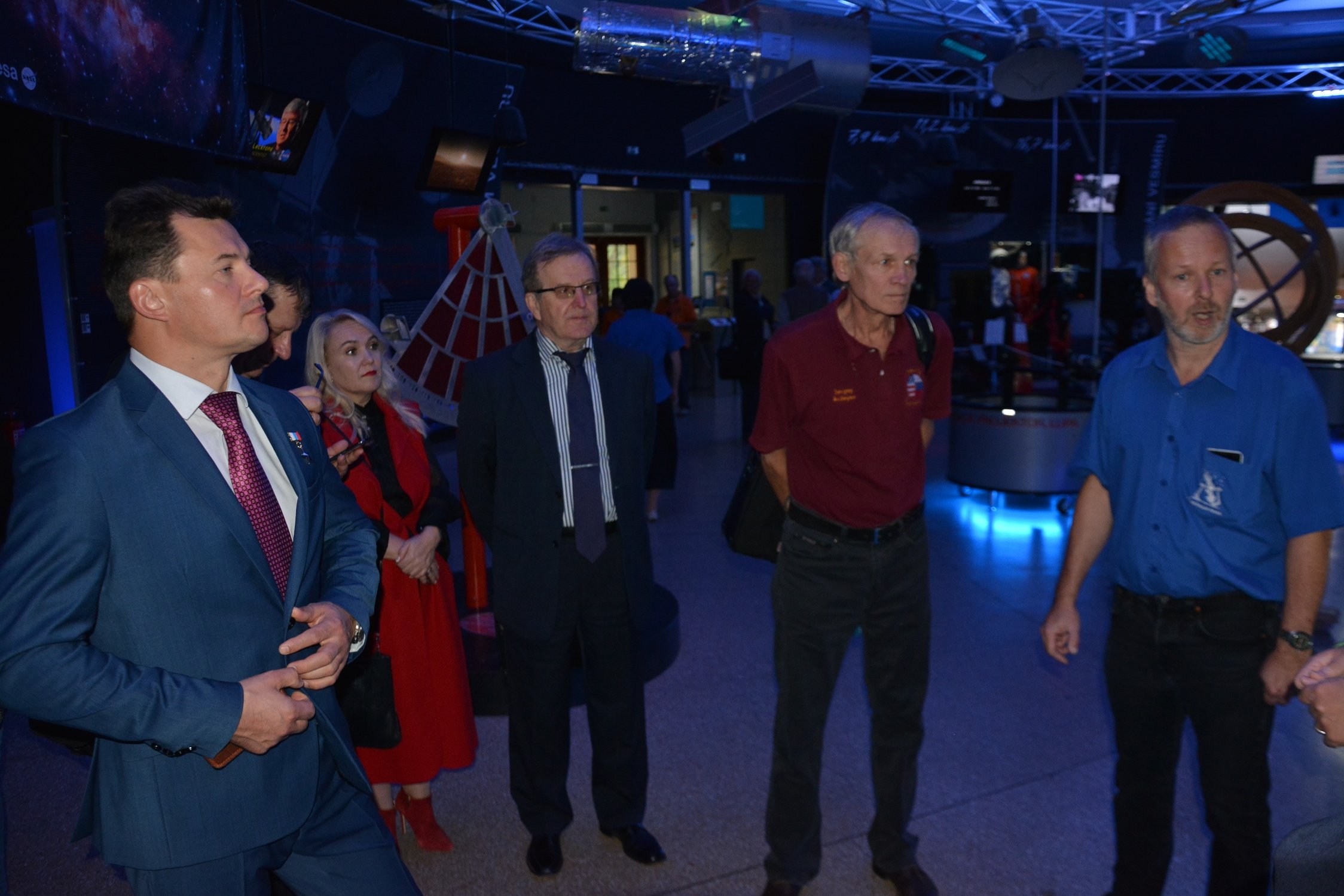 Zástupce ředitele pro vědeckou činnost J. Šifner seznámil hosty s expozicí planetária a předal kosmonautům pamětní stříbrné medaile Planetária Praha, věnované jeho 55. výročí.
