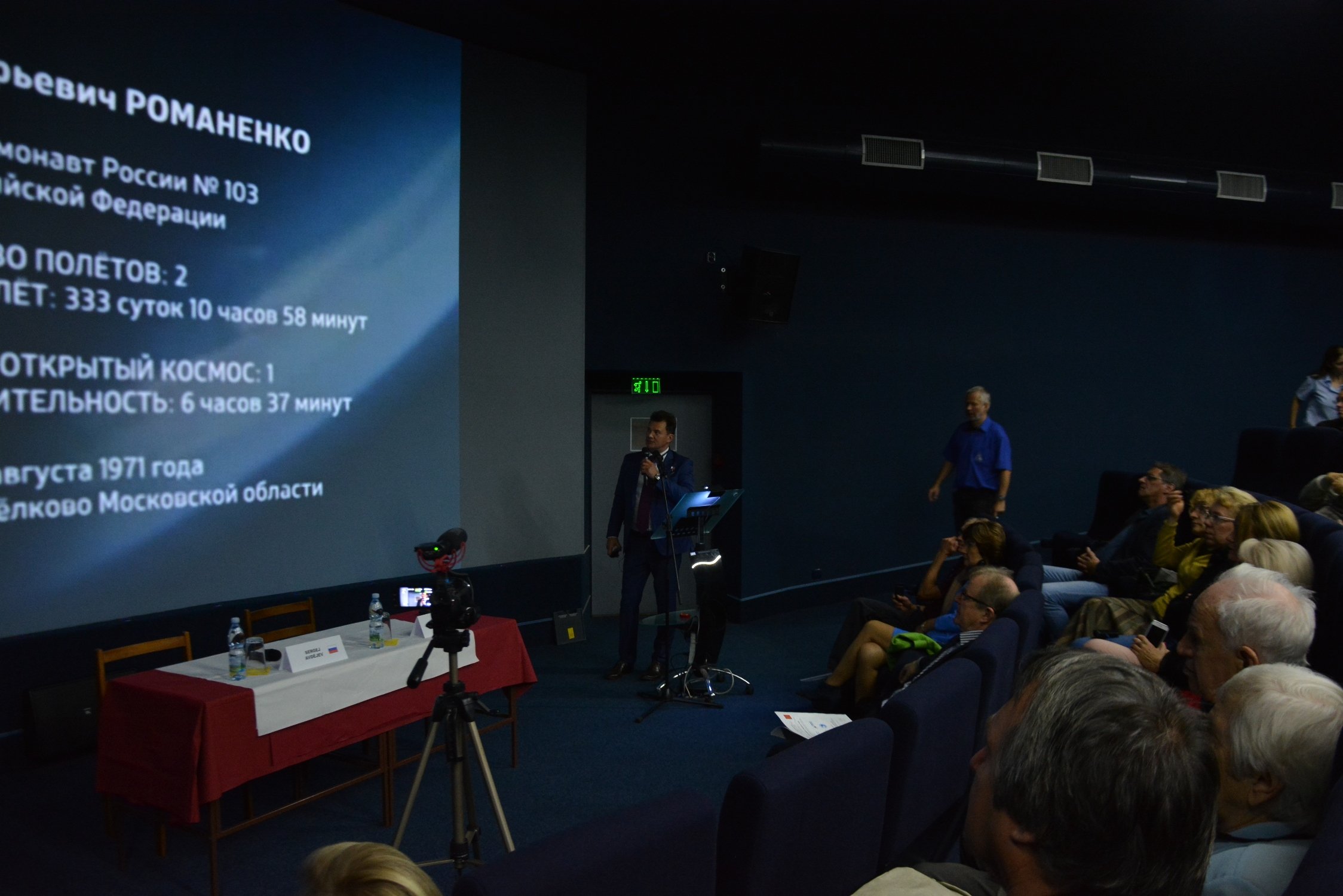 Kosmonaut ve druhém pokolení, Hrdina RF Roman Romaněnko pověděl o své cestě k letu od rozhodnutí stát se kosmonautem, do zařazení do oddílu kosmonautů, práce na palubě mezinárodní vesmírné stanice (MVS) a výstupu do otevřeného kosmického prostoru. Zvlášť zdůraznil, že jeho otec, Jurij Romaněnko, uvítal na palubě vesmírné stanice „Saljut – 6« posádku ve složení A. Gubarev a československý kosmonaut V. Remek. Připomněl, že 26. září je dnem narození Vladimíra Remka a srdečně českému kosmonautovi poblahopřál. Všichni přítomní v sále se k němu připojili.