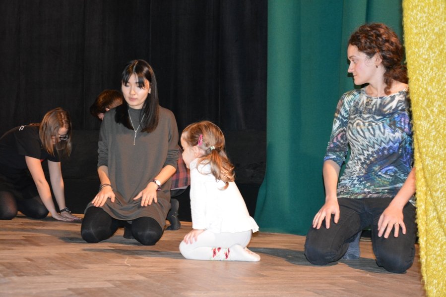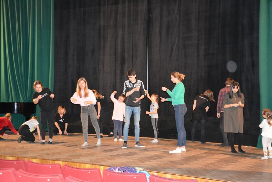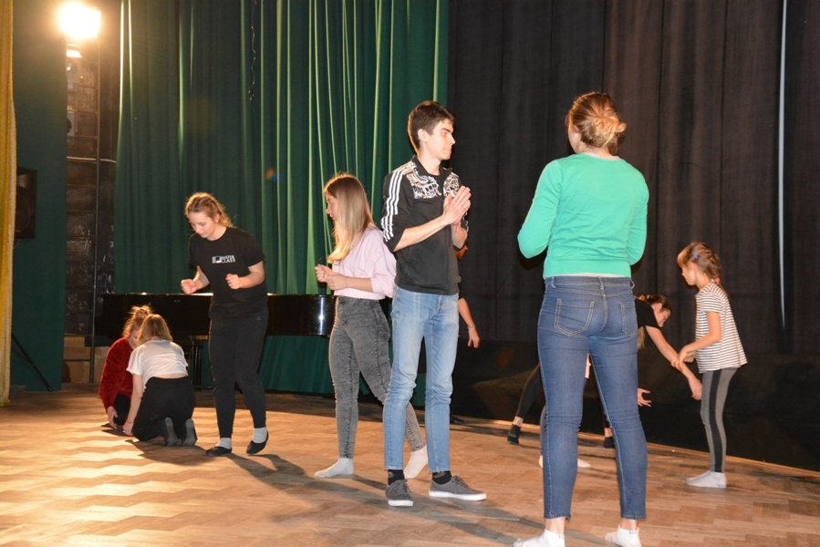 Участники начали занятие с разминки и этюдов на музыкальные ассоциации, учились работать в команде через упражнения в танце. Далее педагоги предложили участникам попробовать себя в этюдах на память физических действий. Большая часть занятия по актерскому мастерству была посвящена тренировке слухового внимания. Молодые артисты должны были внимательно слушать задания ведущего и выполнять его в команде.