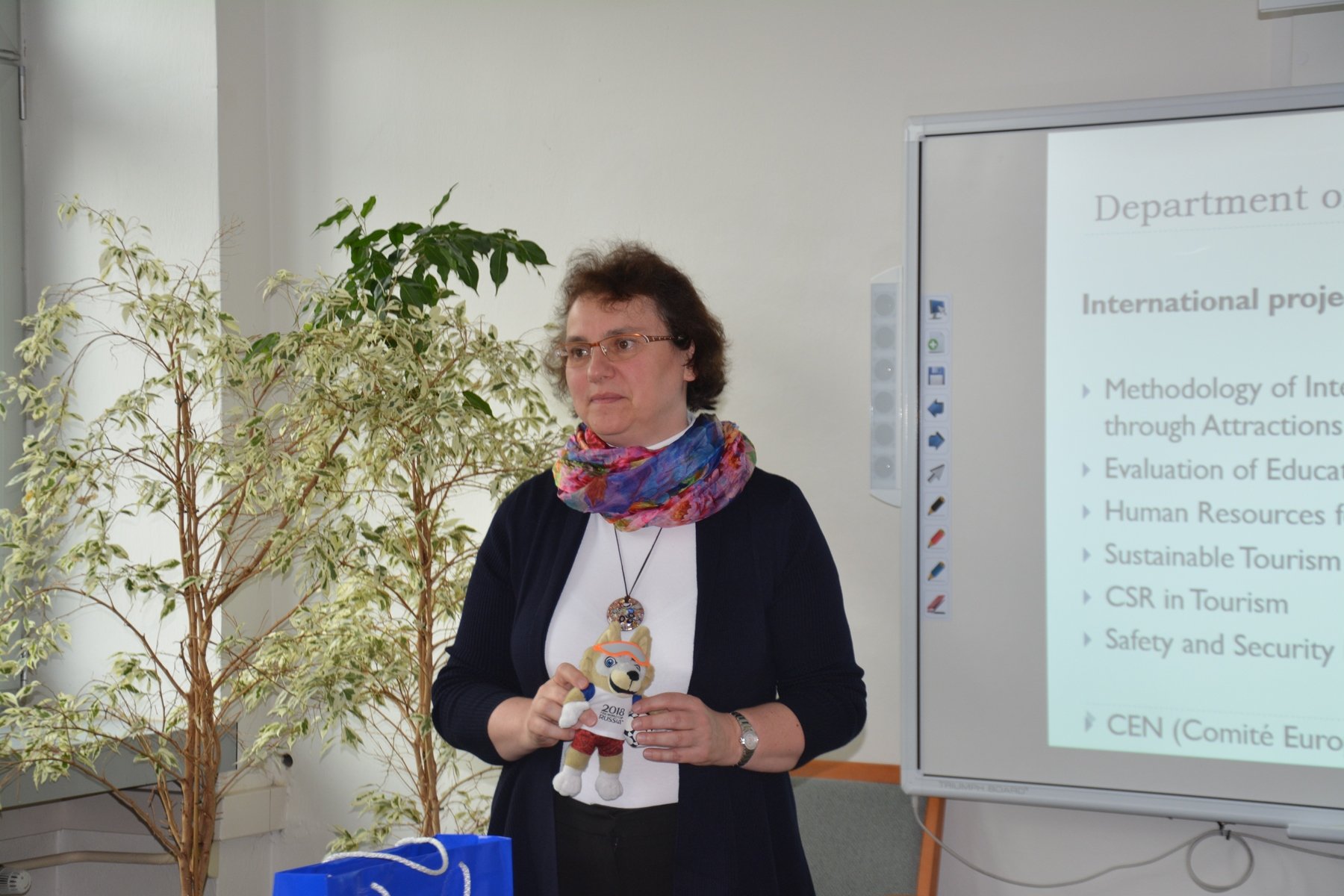 Затем делегация посетила Высшую школу экономики Праги. На факультете международных отношений заведующая кафедрой туризма Либьена Яролимкова и преподаватель маркетинга Зузана Квиткова рассказали о работе кафедры и наиболее значимых научных проектах. Пригласили к сотрудничеству в области научных исследований культурного наследия, совместного проведения научно-практических Летних школ в области курортного дела и совместных публикаций. После официальной части участники встречи обсудили конкретные вопросы преподавания маркетинга и ознакомились с учебными аудиториями.