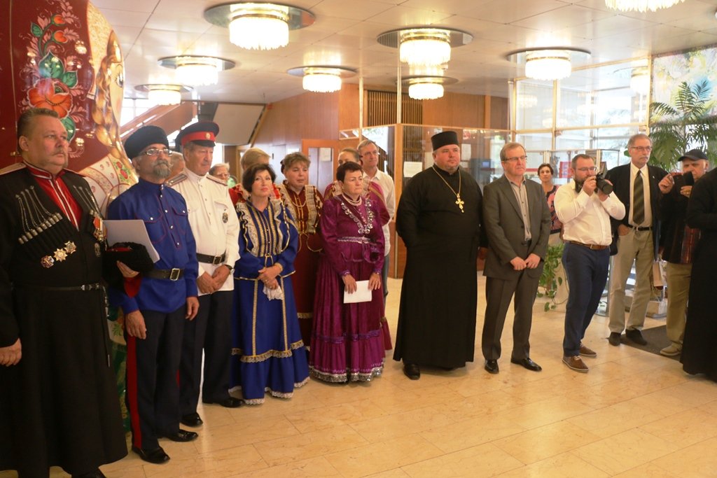 На торжественном открытии выставки выступили первый секретарь Посольства России в Чехии Николай Брякин, торговый представитель Российской Федерации в Чехии Сергей Ступарь, и. о. руководителя представительства Россотрудничества в Чехии Андрей Кончаков, секретарь Синодальной комиссии по взаимодействию с казачеством отец Тимофей Чайкин и атаман Всеказачьего союза Чешских земель и Словакии Михаил Дзюба. Старинные казачьи песни исполнил хор Всеказачьего союза.