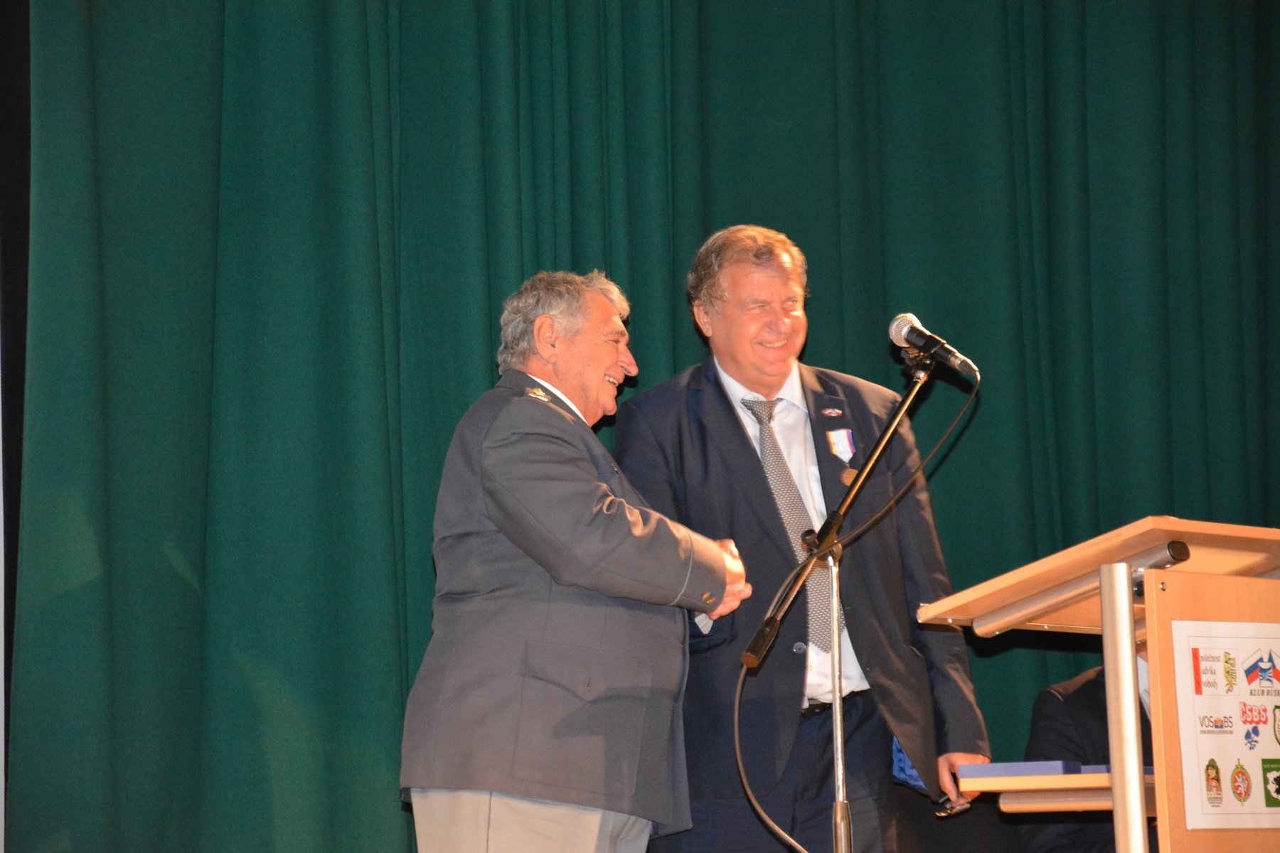 Председатель Чешского союза летчиков, космонавт-дублер Олдржих Пелчак поздравил всех собравшихся со 100-летием образования Чехословакии и 100-летием чешской авиации и вручил Зденеку Збытеку памятную медаль своей организации.