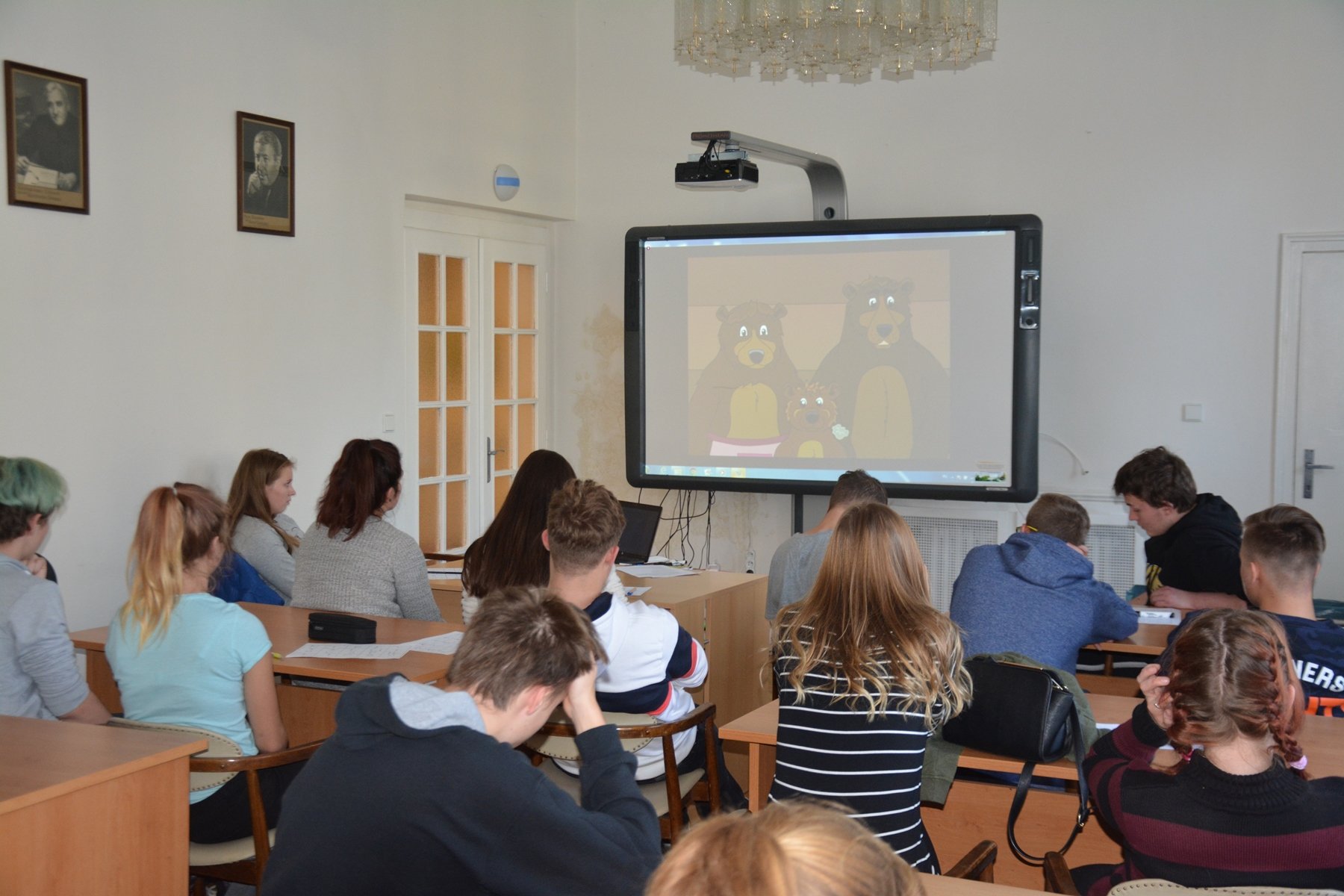 После экскурсии по РЦНК на Курсах русского языка для студентов был проведен открытый урок, во время которого они в игровой форме проверили свои знания русского алфавита, а также узнали некоторые интересные факты о географии, истории и культуре Российской Федерации. В заключении посмотрели известный российский мультфильм «Маша и медведи».
