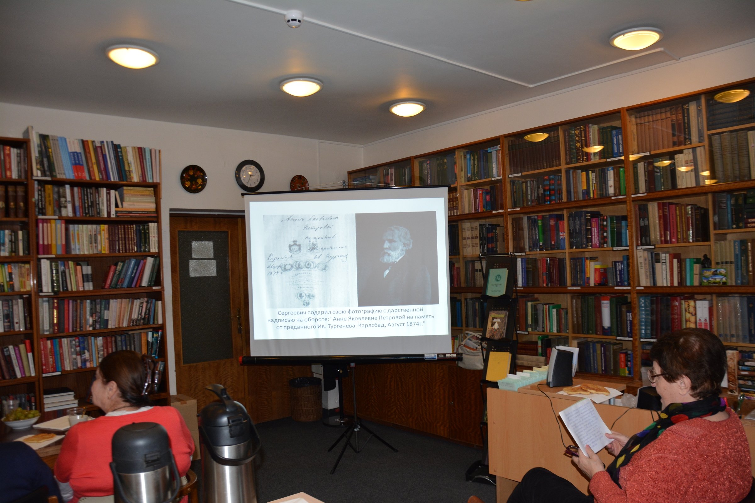 Часть вечера была посвящена истории создания русскоязычной библиотеки в Париже, которая должна была по замыслу стать не только книгохранилищем, но и центром, вокруг которого объединилась бы молодежь. Личные книги Ивана Тургенева стали основой будущей библиотеки. Датой рождения «Тургеневки» считается 15 февраля 1875 года – день, когда Иваном Тургеневым был организован сбор средств на покупку книг и аренду помещения для библиотеки среди известных деятелей культуры, находившихся в то время в Париже.