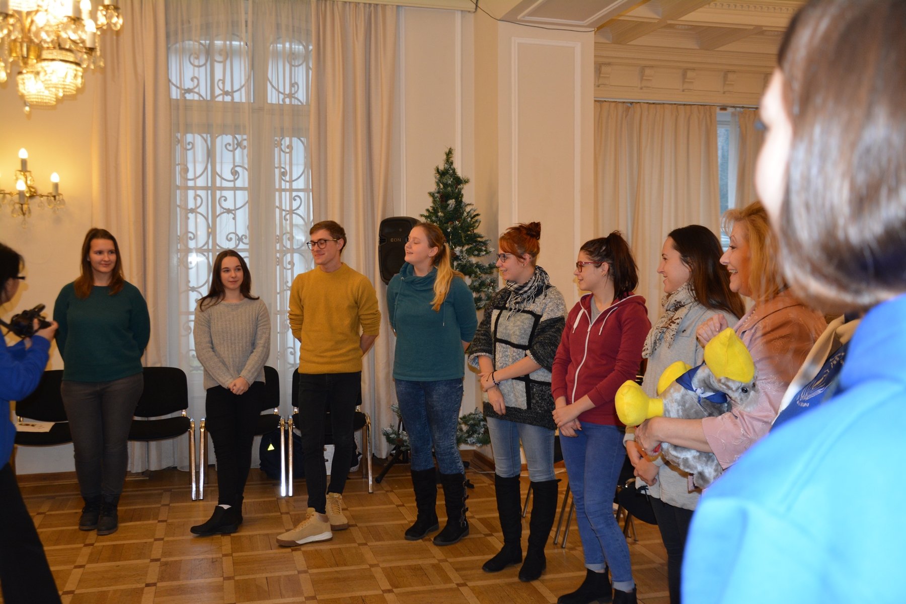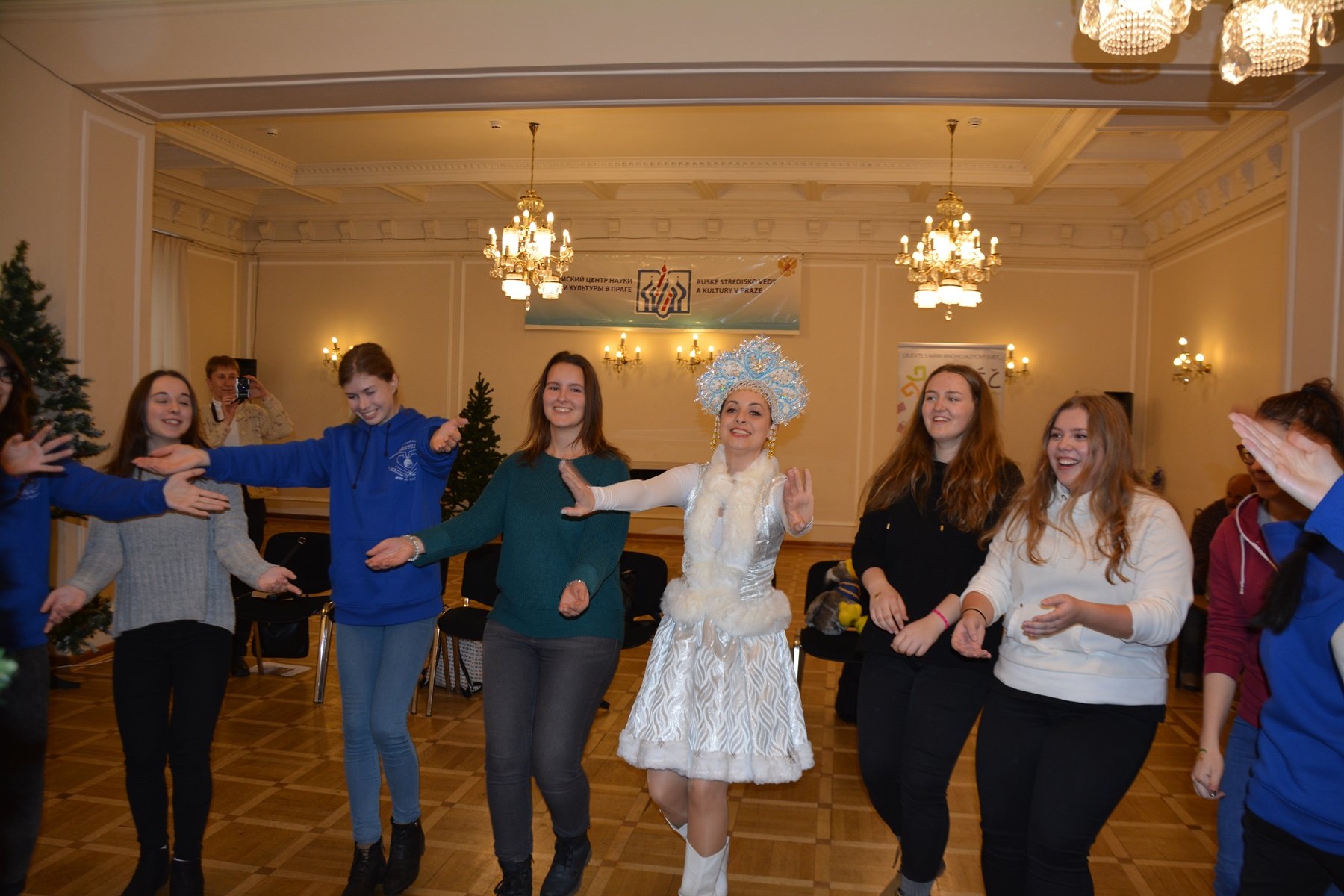 Студенты-волонтеры центра ревнителей русского языка, образования и культуры на базе университета имени А.И. Герцена подготовили для чешских ребят квест на тему «Русские традиции: Новый год и Рождество», а руководитель МКИ «Ключ» Анна Евсина познакомила гостей с тем, как проходят русские «елки» – новогодние и рождественские праздники. Чешские ученики разучили песню «В лесу родилась елочка», танец «Кадриль», играли в разные игры у елки. В конце праздника все получили подарки от Деда Мороза– известный российский шоколад «Аленка».