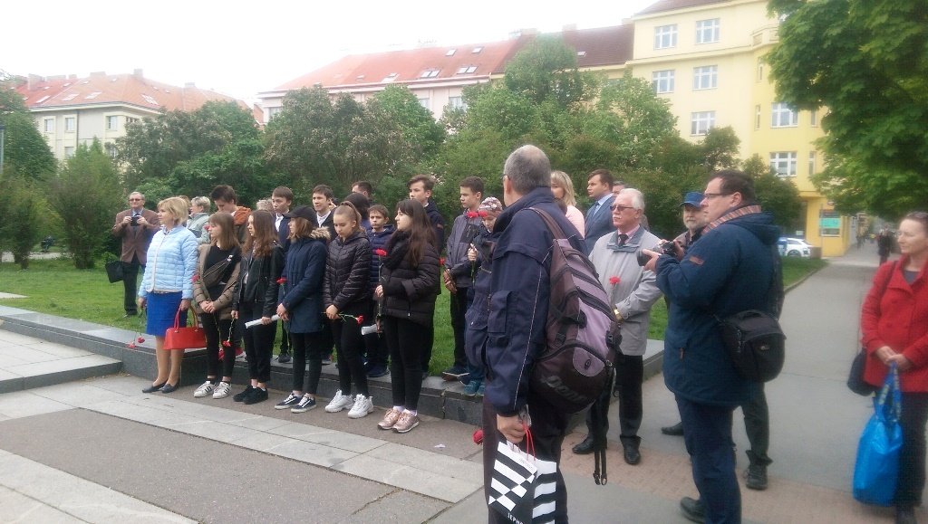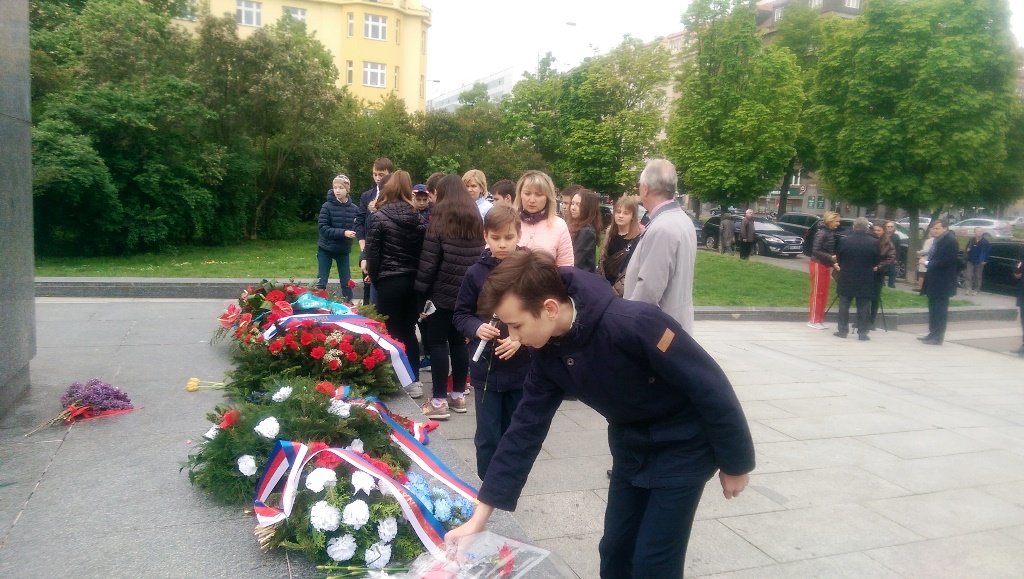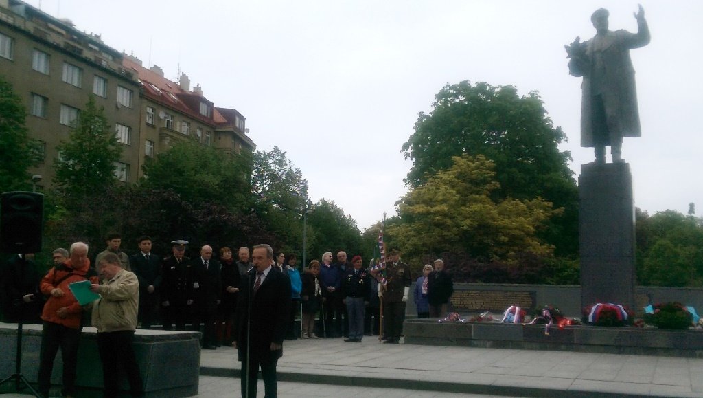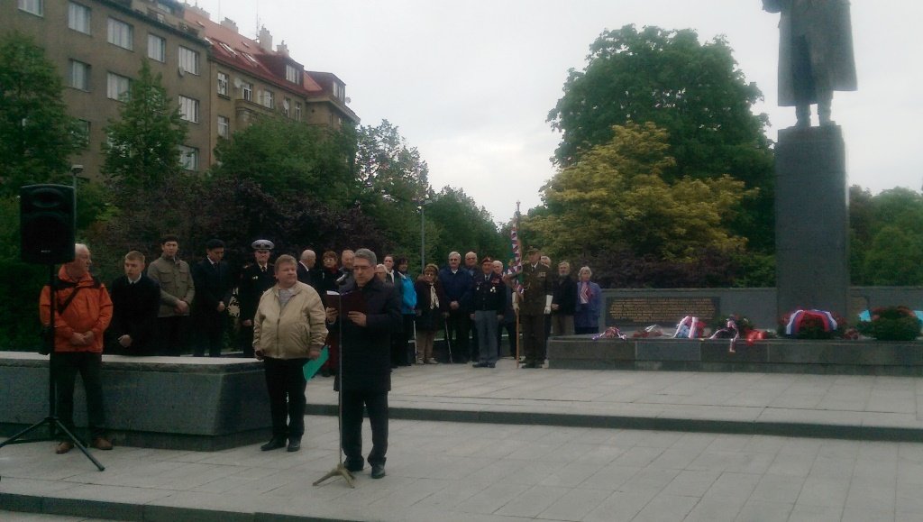 Посол Российской Федерации Александр Змеевский напомнил, что ранним утром 9 мая «советские войска пришли на помощь отчаянно сражавшимся жителям Праги», призвал «не забывать об этом. Особенно сегодня, когда в ряде европейских государств предпринимаются попытки переписать историю Второй мировой войны, происходит героизация военных преступников, а освободительная роль Советского Союза замалчивается». С сожалением отметил, что подобные тенденции присутствуют и в Чехии. В этой связи упомянул демонтаж городскими властями со стены Староместской ратуши мемориальной таблички, увековечивавшей освобождение Праги войсками 1-го Украинского фронта под командованием маршала Советского Союза Ивана Степановича Конева. Напомнил, что памятная табличка «была размещена в 1946 году участниками Пражского восстания, которые, таким образом, проявили свою благодарность». Также отметил, что появившиеся в прошлом году возле памятника И. С. Конева «некие пояснительные таблички» превратно толкуют роль почетного гражданина города Праги в событиях 1968 года. В заключение подчеркнул, что «мы все в долгу перед теми, кто ценой своей жизни принес свободу и мир в Европу, спас целые народы от полного уничтожения».