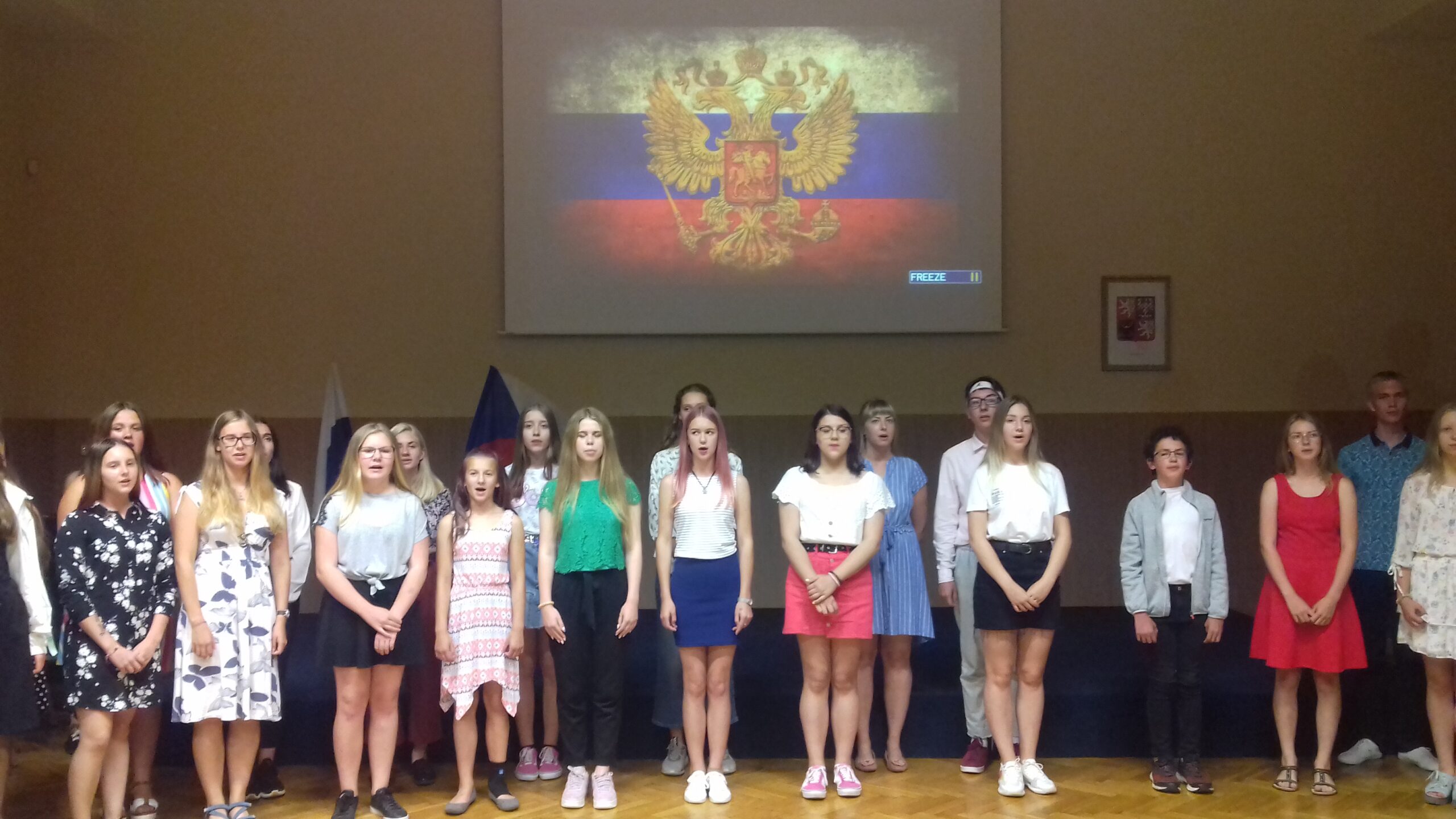 13 июля состоялось торжественное закрытие первой смены XIIIМеждународной летней школы с изучение русского и чешского языков. К этому дню ребята подготовили культурную программу на чешском и русском языках, которую продемонстрировали на заключительном вечере. Он начался с исполнения учащимися гимнов Российской Федерации и Чешской Республики. В программе вечера были также народные и современные танцы, песни на чешском языке в исполнении российских ребят и песни на русском языке в исполнении чешских школьников. В честь 220-летия со дня рождения А. С. Пушкина прозвучало стихотворение поэта «Соловей и роза» в исполнении остравского школьника Эдуарда Войводика.