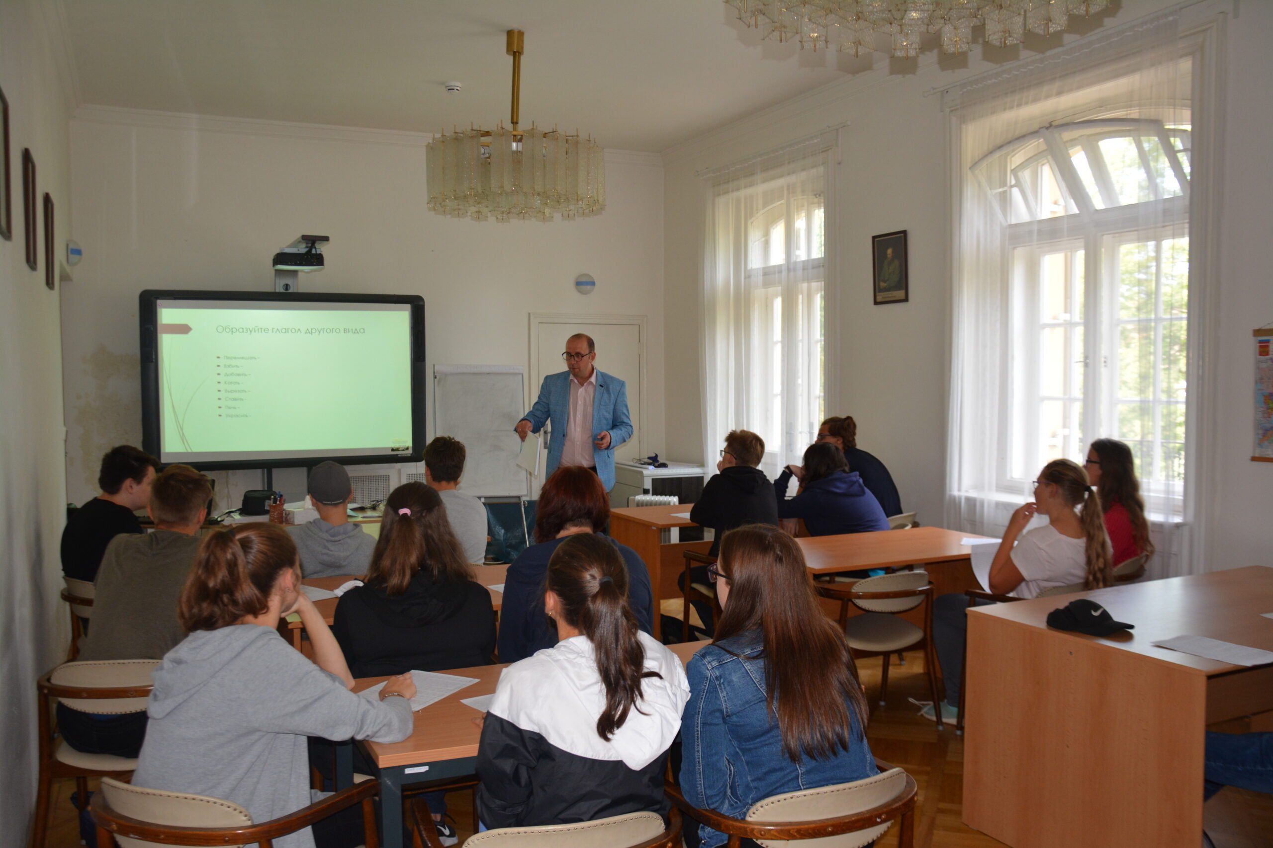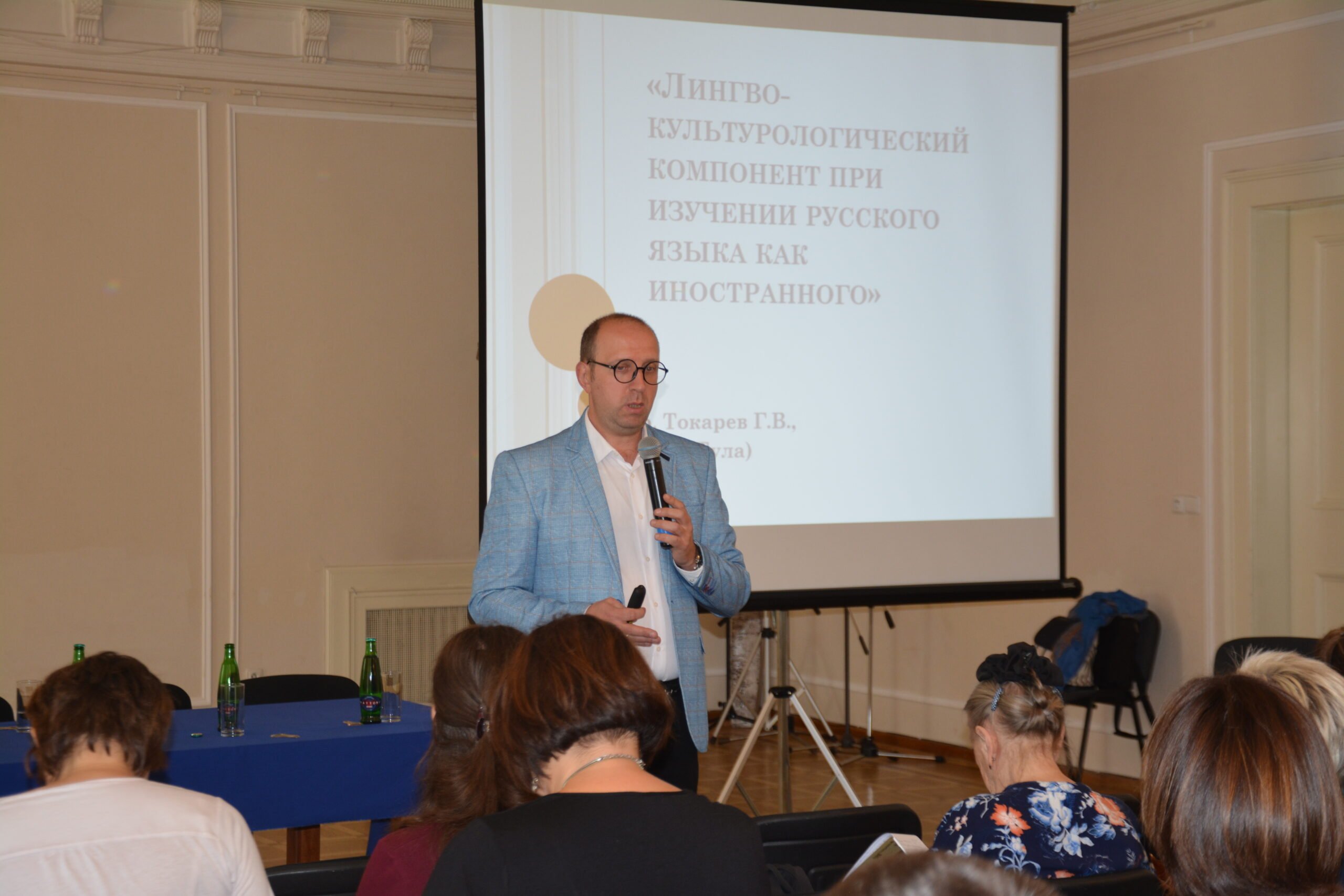 Лекции профессора ТГПУ Григория Токарева были посвящены лингвокультурологическому компоненту и приемам развития коммуникативной компетенции обучающихся при изучении русского языка как иностранного. Затем в мастер-классе он продемонстрировал участникам курсов некоторые игровые технологии, которые можно применять при изучении лексики и грамматики русского языка.