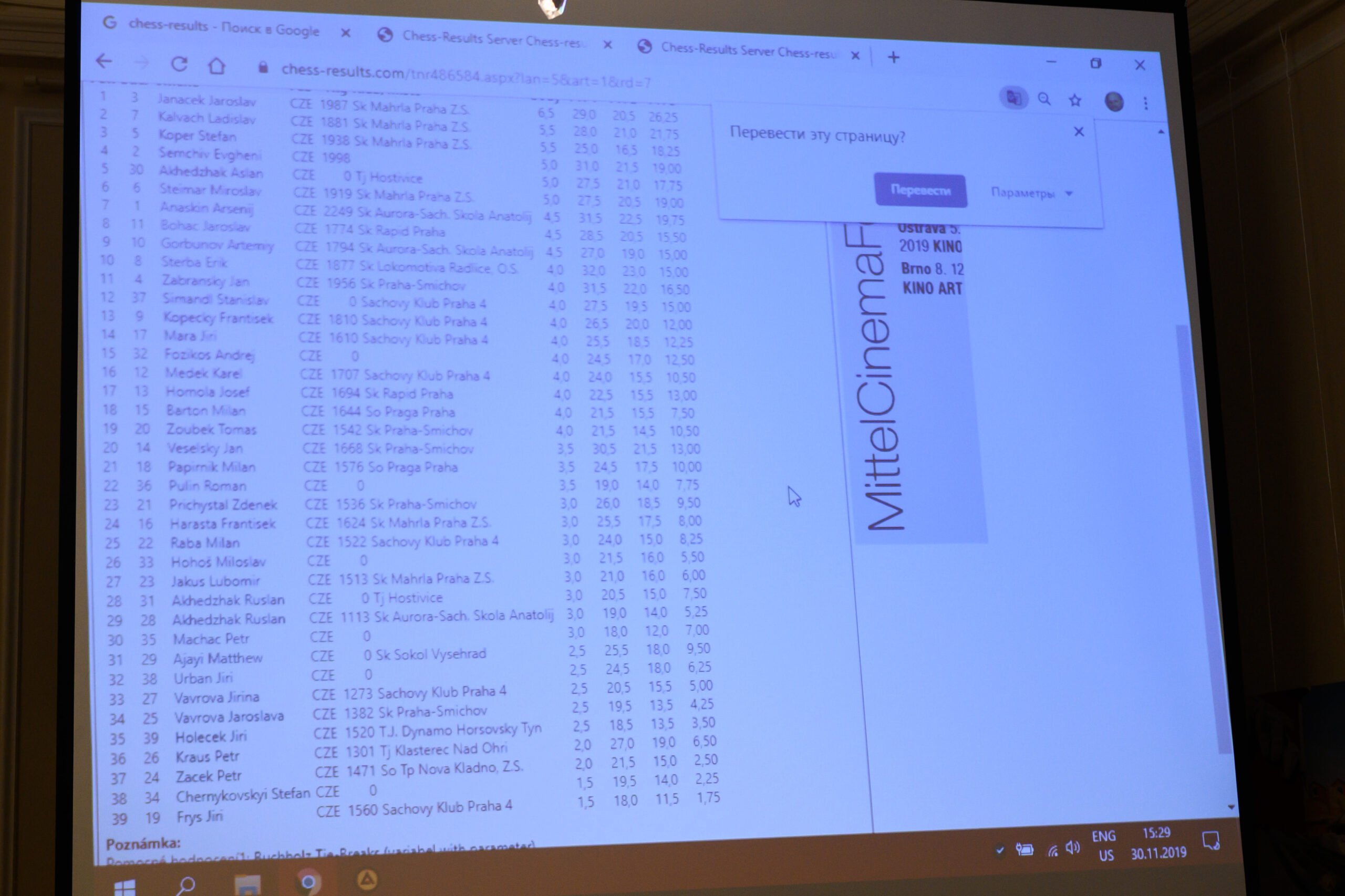 30 ноября 2019 года в Хрустальном зале Российского центра науки и культуры в Праге прошёл XIV Международный любительский шахматный турнир «Зимний гамбит-2019». Мероприятие подготовлено и проведено «Шахматной школой Анатолия Карпова» при РЦНК в Праге, чешским шахматным клубом «Смихов» и «Координационным советом российских соотечественников» при поддержке представительства Россотрудничества в Чехии.