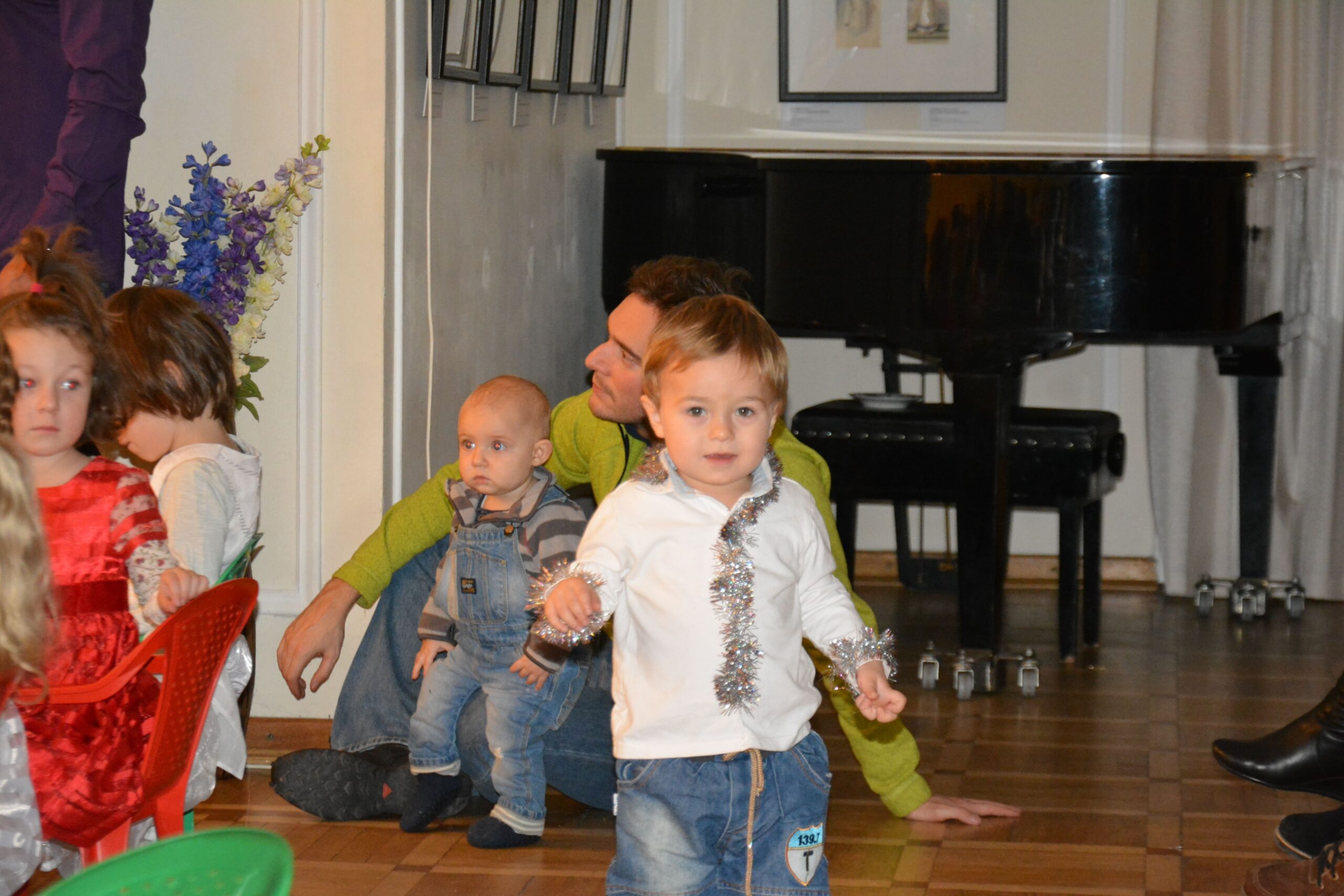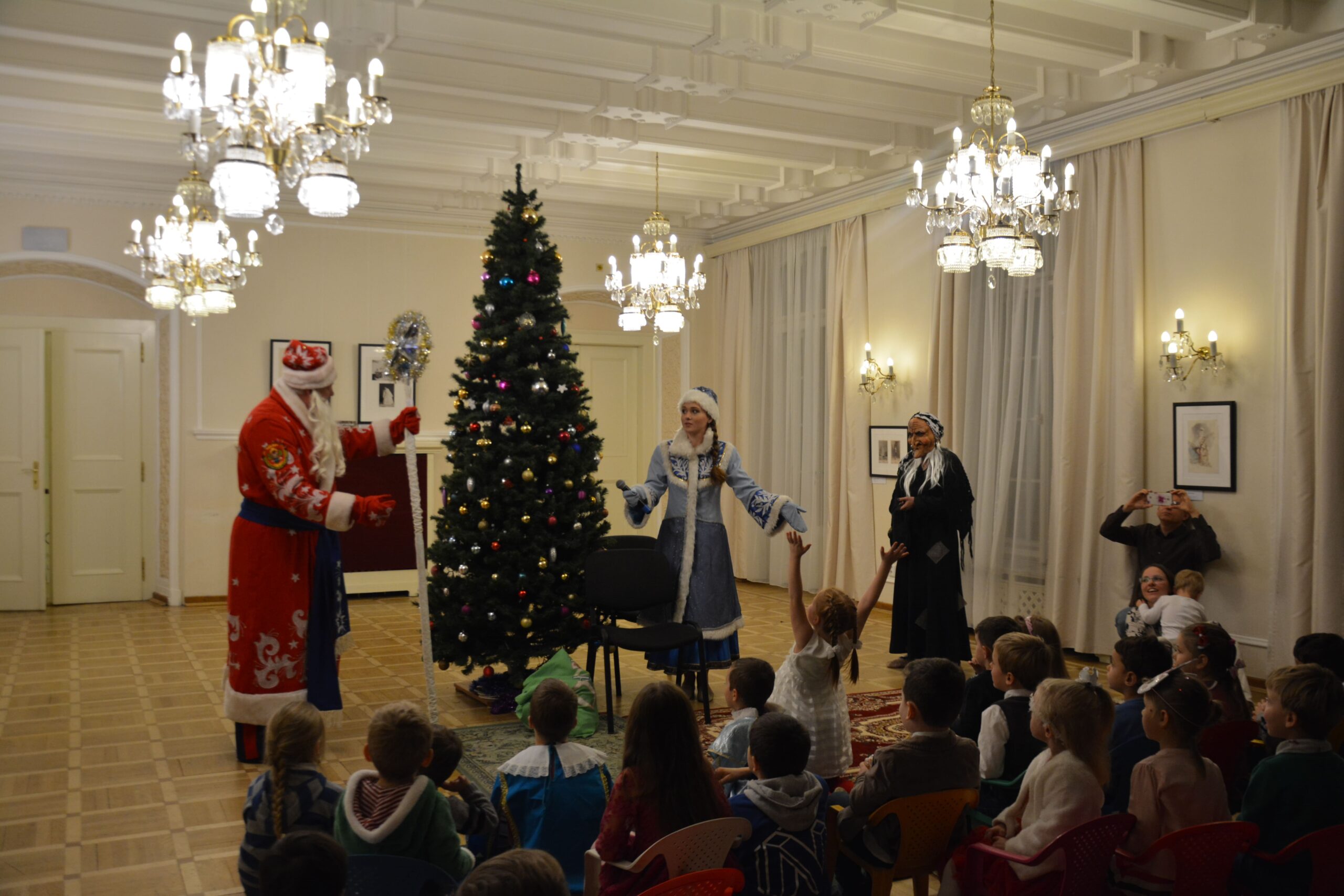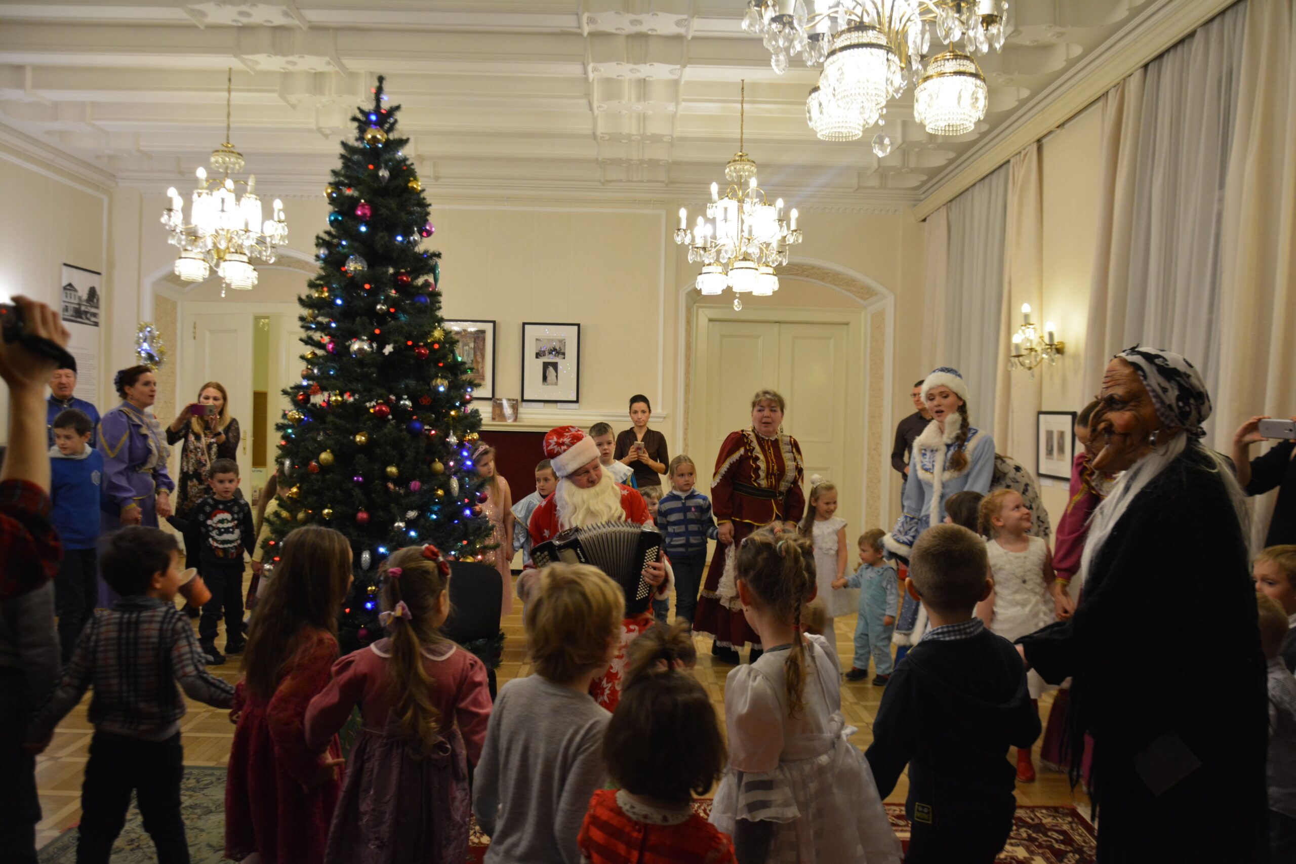 Кульминацией праздника стало появлениев зале главных новогодних героев – Деда Мороза и Снегурочки. Конечно же, не обошлось без козней Бабы-Яги, которая не желала делить внимание детей с Дедом Морозом, но быстро подобрела и даже станцевала с детьми.