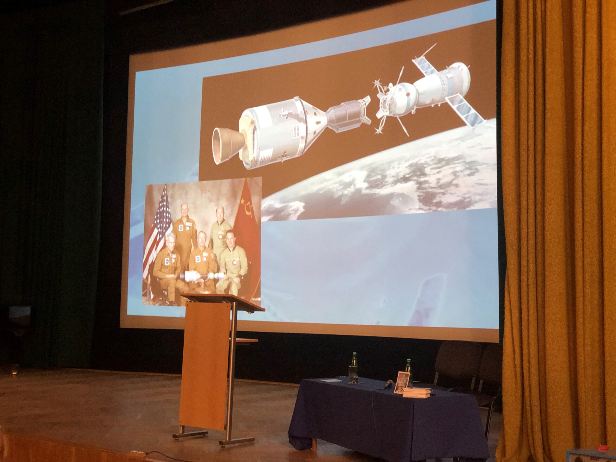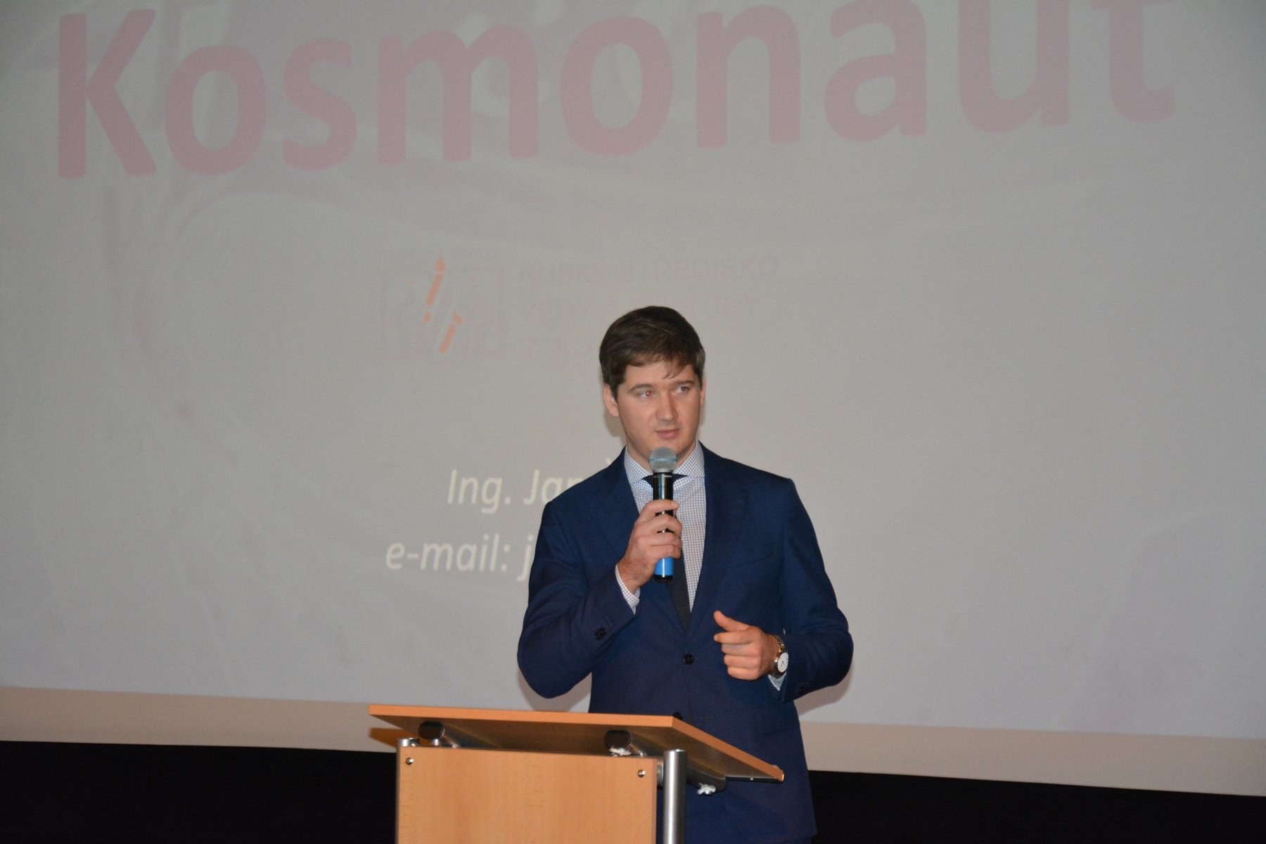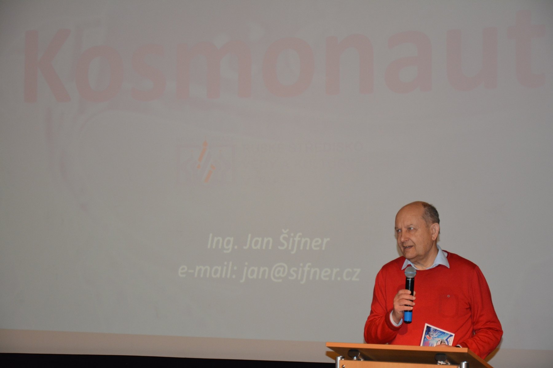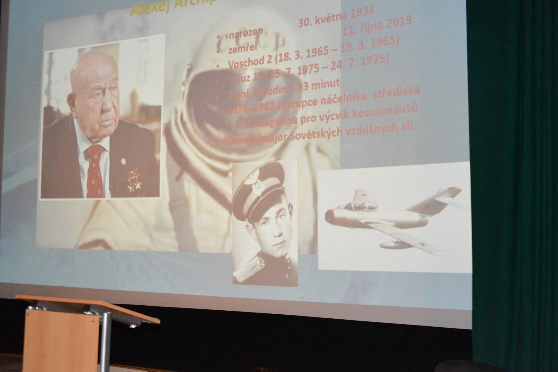 Затем специалист по космонавтике, инженер Ян Шифнер провел лекцию-презентацию «Космонавт Алексей Леонов: первый выход человека в космос», в ходе которой рассказал чешским школьникам о развитии пилотируемой космонавтики в СССР. Значительную часть выступления он посвятил выходу в открытый космос первого человека, лётчика-космонавта СССР Алексея Архиповича Леонова. Подчеркнул важную роль совместных усилий разных стран мира в освоении космического пространства и привел в качестве примера программу совместного экспериментального пилотируемого полета советского космического корабля «Союз-19» и американского корабля «Аполлон», который был осуществлен 15 июля 1975 года.