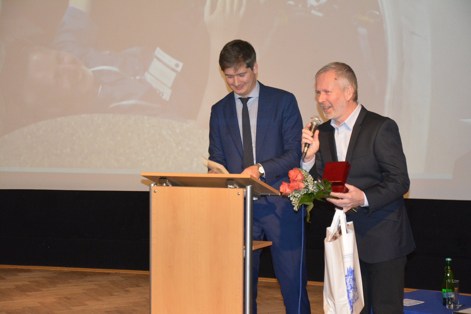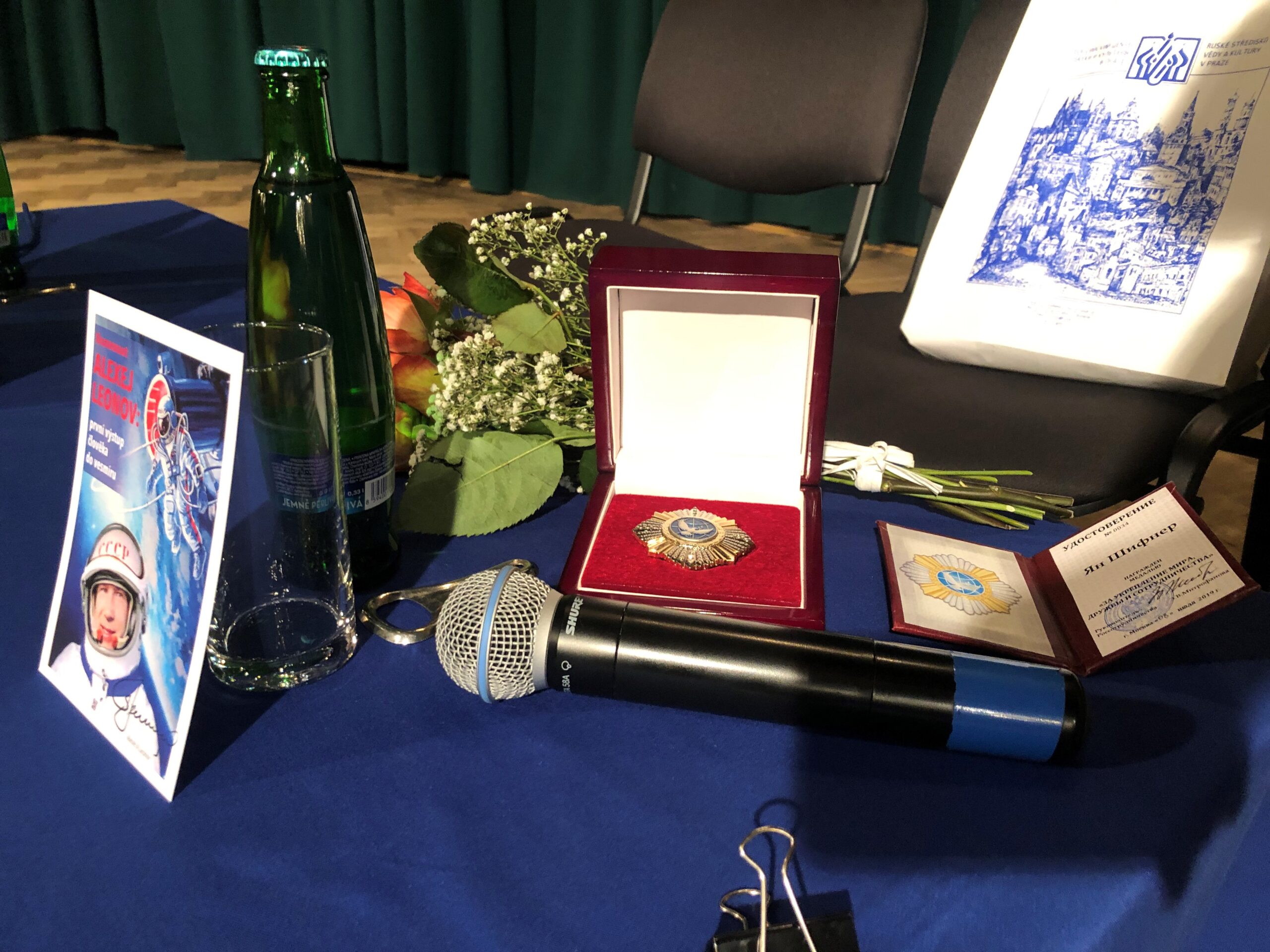 В завершение лекции и.о. руководителя представительства Россотрудничества в Чехии Андрей Кончаков поблагодарил инженера Яна Шифнера за многолетнее сотрудничество с Российским центром науки и культуры в Праге, в рамках которого были реализованы многочисленные мероприятия в Планетарии города Праге. Вручил Яну Шифнеру медаль федерального агентства Россотрудничество «За укрепление мира, дружбы и сотрудничества».