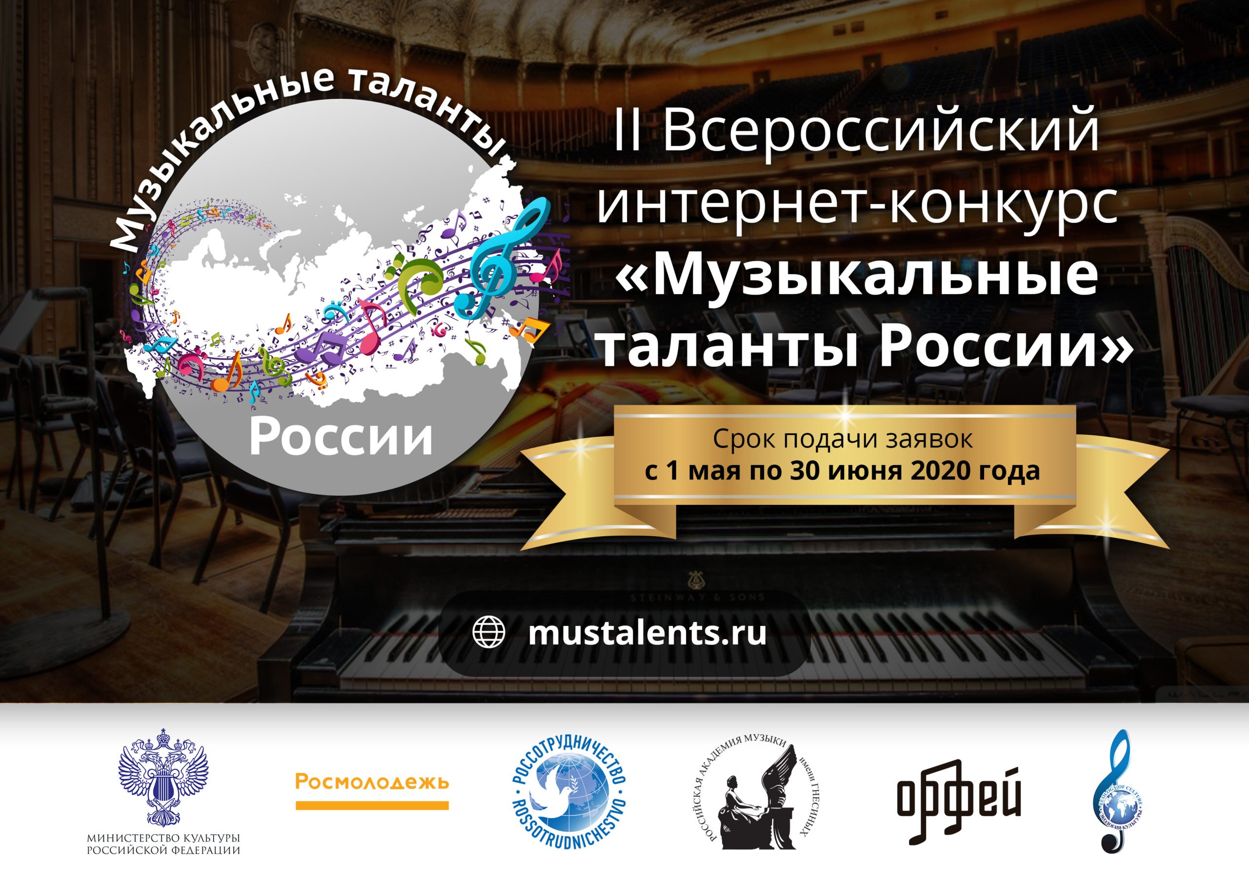 II Всероссийский интернет-конкурс «Музыкальные таланты России» проводится АНО «Экология культуры» при поддержке Министерства культуры Российской Федерации, Федерального агентства по делам молодежи (Росмолодежь), Федерального агентства «Россотрудничество», Российской академии музыки имени Гнесиных и радиостанции классической музыки «Орфей». Приём заявок проходит с 1 мая по 30 июня 2020 года на сайте Проекта — www.mustalents.ru. Все обладатели Гран-при и выбранные лауреаты будут приглашены к участию в гала-концерте лауреатов Конкурса в Большом концертном зале Российской академии музыки имени Гнесиных. Также участников ждут специальные призы от Партнеров Конкурса.
