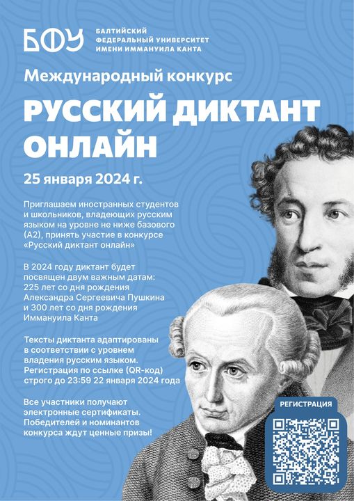 Русский диктант – это не только лингвистическое состязание знатоков русского языка, но и возможность узнать новое о русском языке и культуре. Ежегодно конкурс сопровождается открытой мини-лекцией по теме диктанта. В 2024 году диктант будет посвящен 225-летию со дня рождения русского писателя Александра Пушкина и 300-летию со дня рождения философа всемирного значения Иммануила Канта.