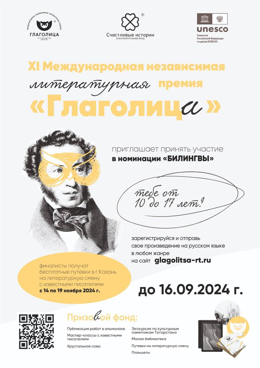 XI Международная независимая литературная премия «Глаголица» объявляет старт приема литературных произведений на русском языке в номинации «Билингвы». К участию приглашаются русскоязычные ребята в возрасте от 10 до 17 лет, проживающие за рубежом, и иностранные граждане, изучающие русский язык в любой стране мира.